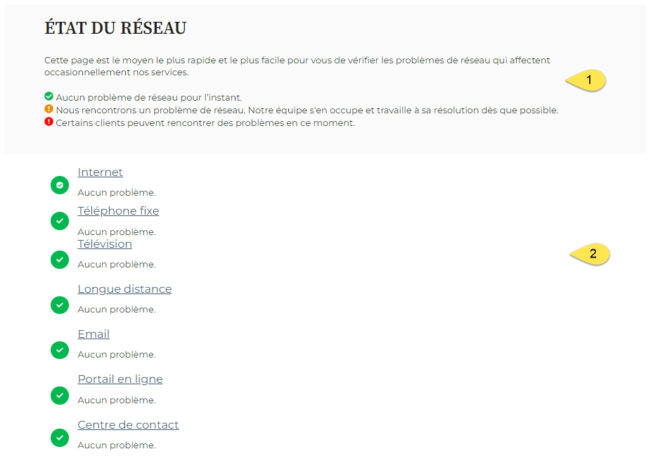 La page État du réseau fournit des données sur la santé de chacun de nos services. Par example, s'il y a un événement impactant le service internet dans la région du Grand Toronto (RGT), ce sera annoncé sur cette page. Ceci peut vous épargner du temps dans le dépannage de votre service internet. Nous performons des mises à jour régulières afin de garder cette page actualisée autant que possible.